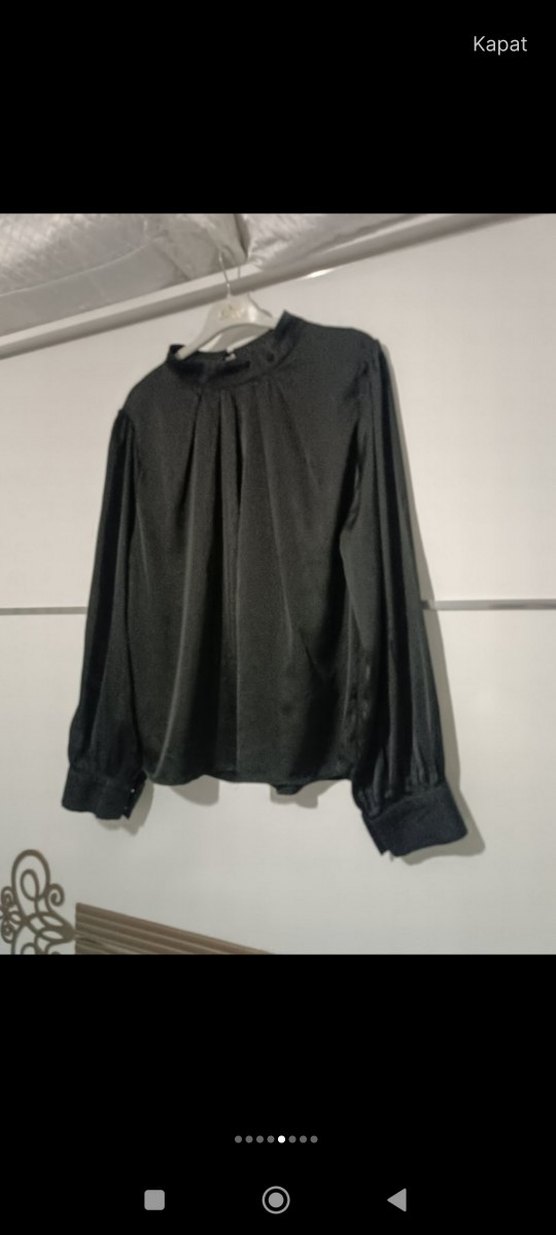 Siyah gomlek, yüksek yakalı ve pilili uzun kollu tasarıma sahiptir. Gevşek kesimi ve ipeksi dokusuyla ofis için uygundur, gotik Paris tarzında bir modeldir.