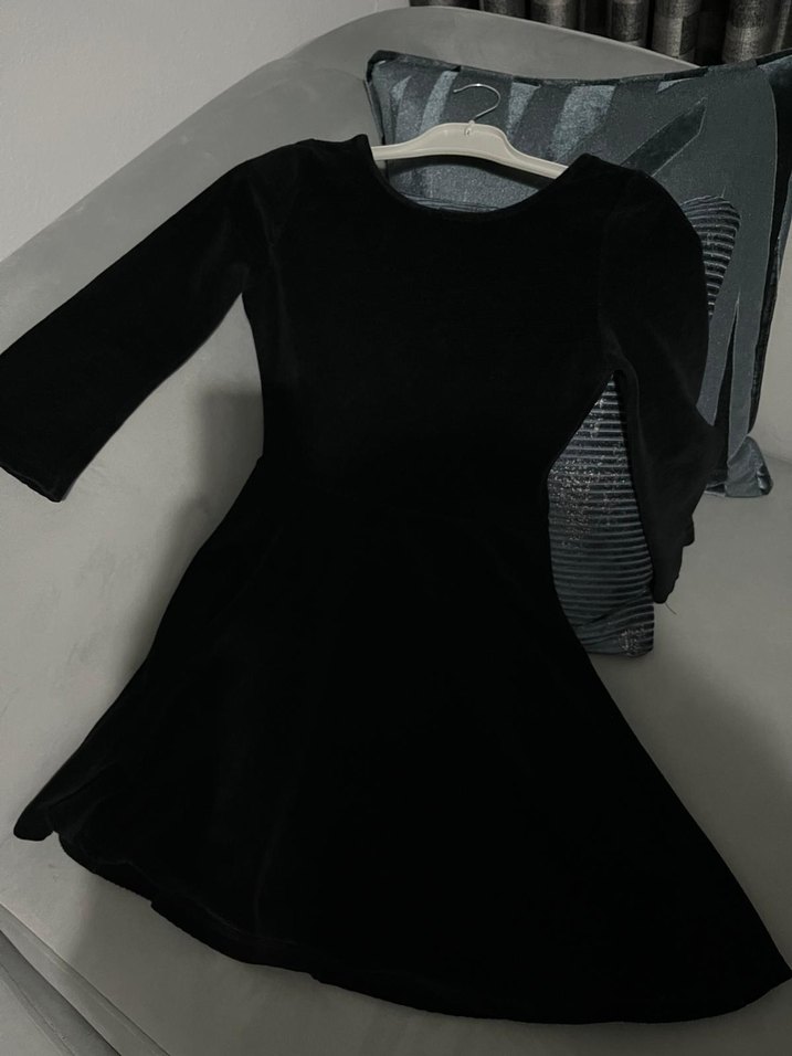 Siyah, uzun kollu, bisiklet yaka ve pilili detaylara sahip, yumuşak sentetik kumaştan yapılmış dar kesim mini elbise