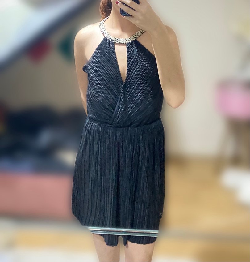 Siyah pilili midi abiye elbise, v yaka, askılı kollu ve vücuda oturan kesimiyle dikkat çeker. Cesur ve gotik tarzda, parti için uygundur. ✨