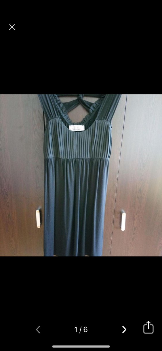 Siyah midi elbise, V yaka ve ince askılıdır. Pilili detaylar elbiseye doku katar, ofis için uygundur.