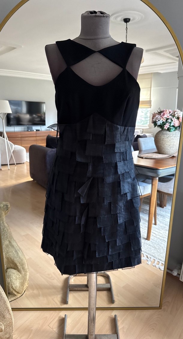 Fitted kesim, pilili etek ve askılı V yaka detaylarına sahip siyah midi elbise, gotik tarzıyla parti için uygun.