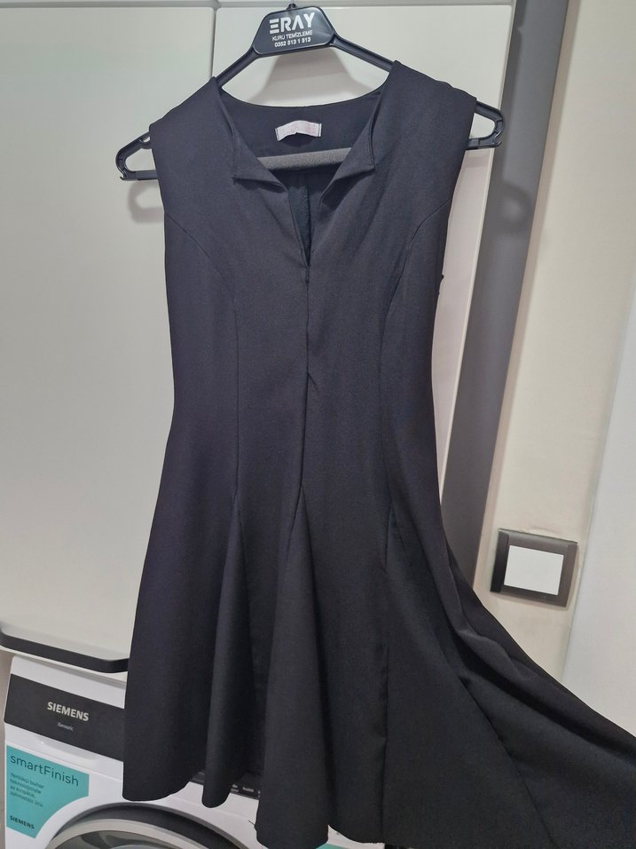 Siyah renkte, V yakalı ve kolsuz, pilili detaylara sahip.Sentetik Kumaş.Trendyol ürünü hiç giyilmedi.70 cm boyu.Çok mini değil.