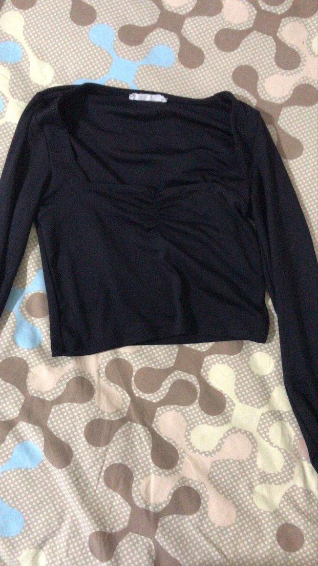 Siyah renkte, uzun kollu, v yaka ve pilili detaylara sahip, sentetik kumaştan yapılmış dar kesim bluz. Günlük kullanıma uygundur.