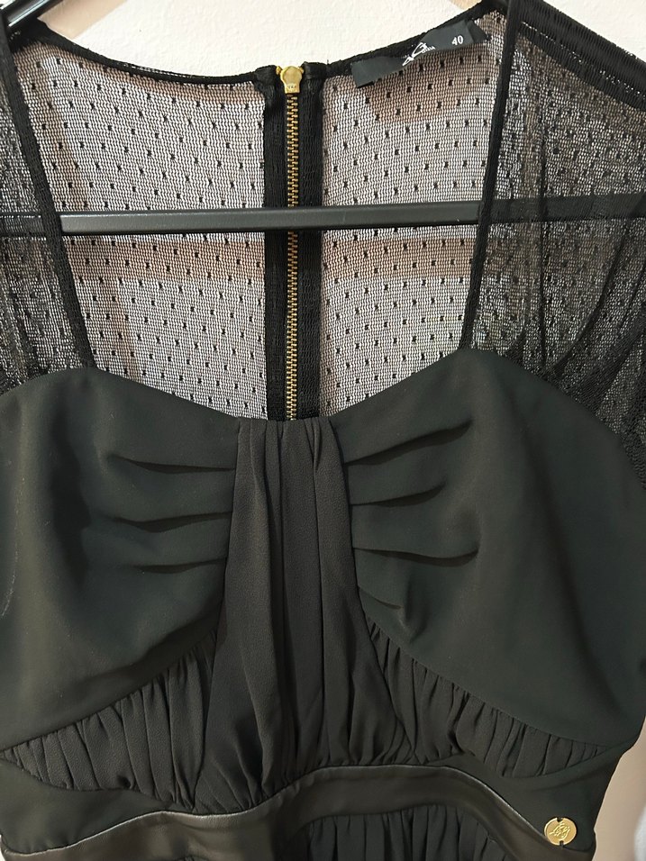 Fitted kesim siyah midi gece elbisesi, V yakalı ve pilili detaylara sahip, straplez ve tül üst sırt tasarımıyla gotik parti tarzına uygun. Bir kez giyildi