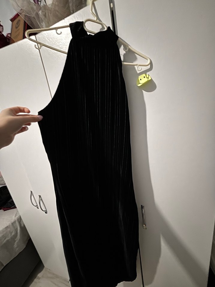 Siyah pilili kumaştan, yüksek yakalı ve kolsuz, vücuda oturan midi uzunlukta gotik tarzda elbise. Kadife parlak kumaş