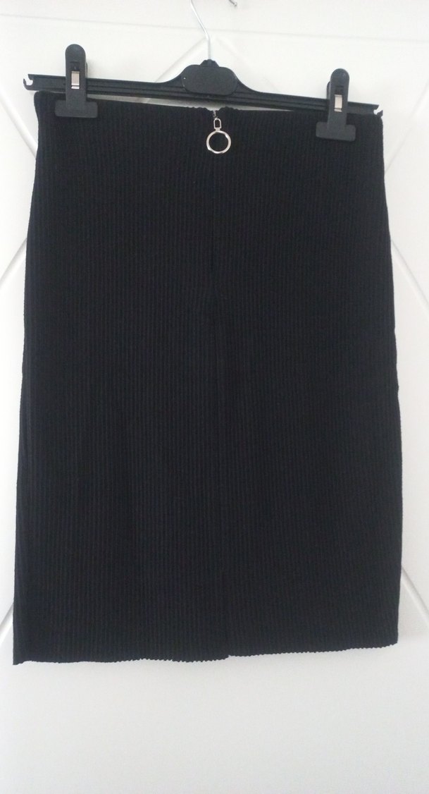 Siyah renkli, pilise çizgili ve vücuda oturan midi kalem etek. Pamuklu kumaştan üretilmiş, ofis ve iş tarzına uygun sade ve koyu renkte.