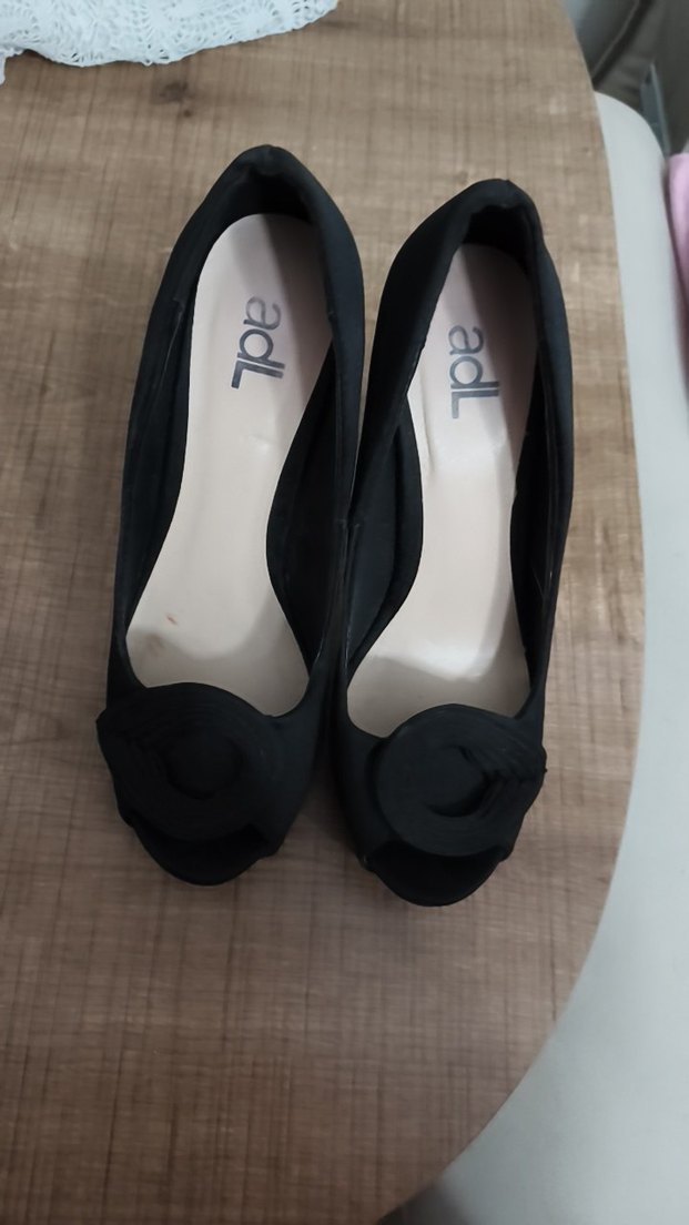 Siyah renkli, piliseli detaylara sahip, kauçuk malzemeden yapılmış dolgu topuk kadın abiye ayakkabısı. Minimalist ve gotik tarzda, romantik akşamlar için uygun. Marka: adl.