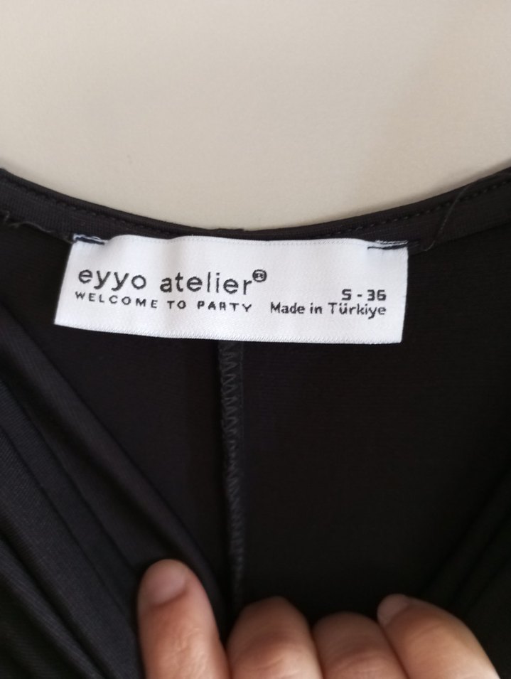 piliseli ve baskılı siyahtulumu. İnce, sentetik kumaştan, kolsuz ve normal boyda. Parti ve sokak modasına uygun.