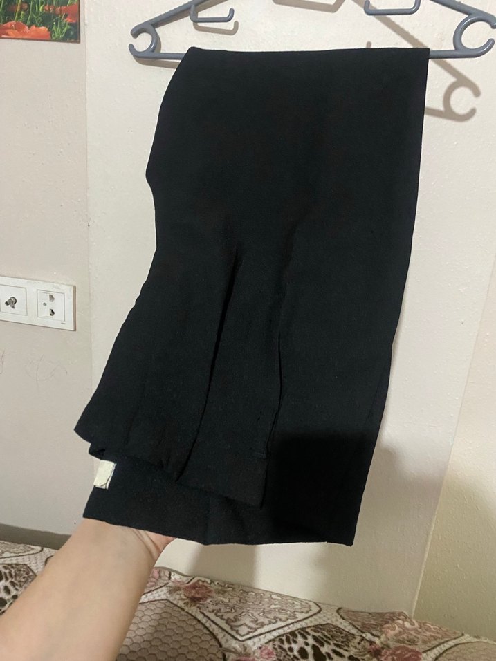 Siyah, piliseli ve normal boy midi kumaş pantolon, şık ve minimalist tarz için uygun, sentetik kumaştan üretilmiştir.