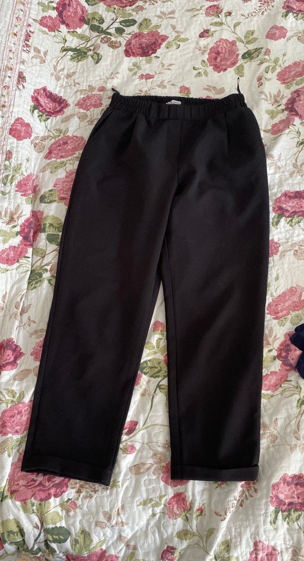 Siyah piliseli, bol kesim ve midi boy kumaş pantolon. Sentetik kumaştan, günlük rahat kullanıma uygun.
