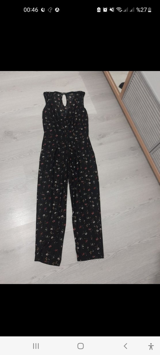 Kolsuz, siyah uzun tulum. Rahat kesim, V yaka ve piliseli detaylar içerir. Koyu renkli tie-dye desenli, yumuşak sentetik kumaştan, dış mekan sokak tarzına uygun.
