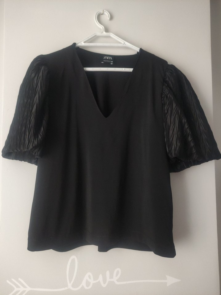 Siyah, piliseli kısa kollu, V yakalı, bol kesim midi uzunluğunda bluz. Ofis için uygun, gotik tarzda.