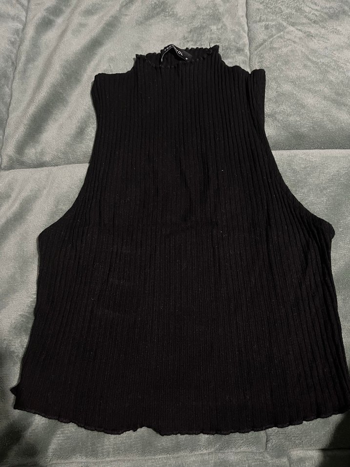 Yüksek yakalı, piliseli ve kolsuz siyah triko süveter, yumuşak keten kumaştan, trend casual görünüme uygun, normal uzunlukta ve vücuda oturan kesimde.