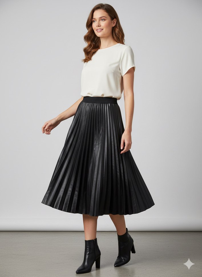 Siyah renkli, yumuşak deri kumaştan piliseli midi uzunlukta, bol kesim ve çağdaş tarza sahip etek, ofis kullanımı için uygundur.