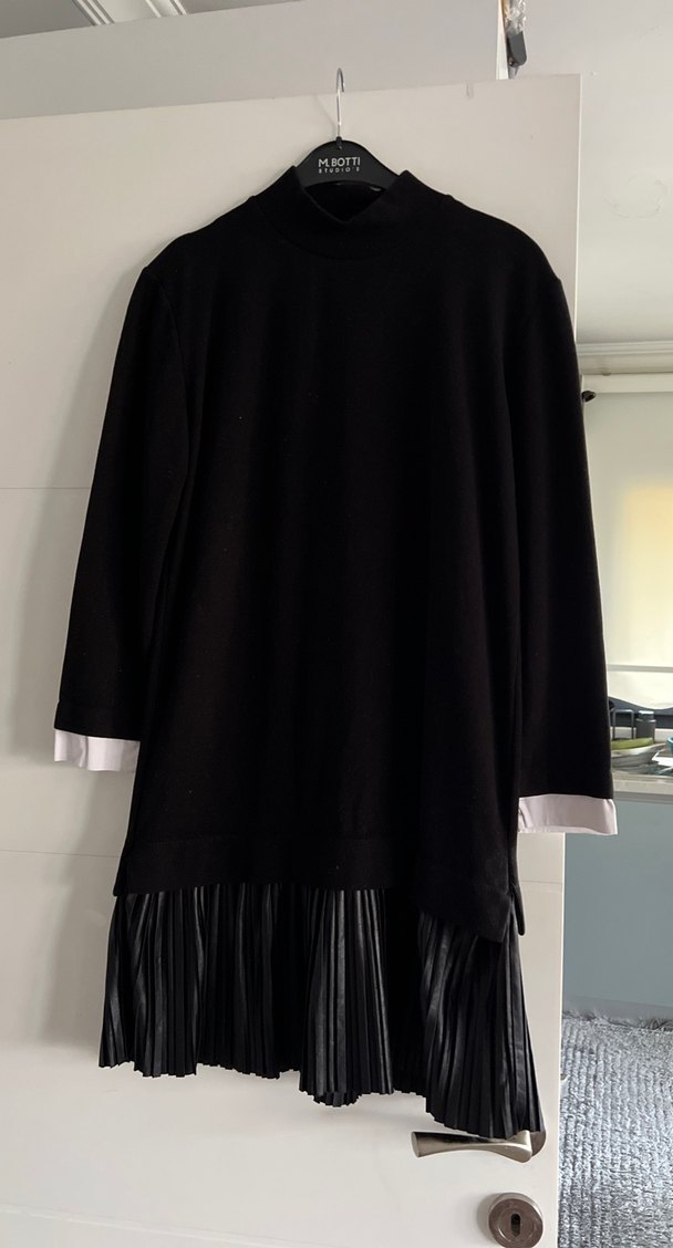 Bu siyah kadın triko elbise, yüksek yakalı ve uzun kolludur. Gevşek kesimi ve piliseli midi boy eteğiyle gotik ve avangart tarzı yansıtır. Yumuşak sentetik kumaştan üretilmiştir, günlük kullanım için uygundur.