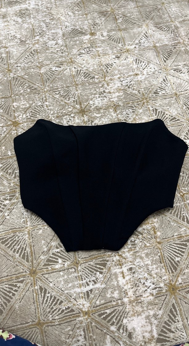 Siyah, piliseli detaylı, straplez ve kısa mini uzunlukta, vücuda oturan büstiyer. Sentetik kumaştan, kolsuz ve gotik parti stiline uygun.