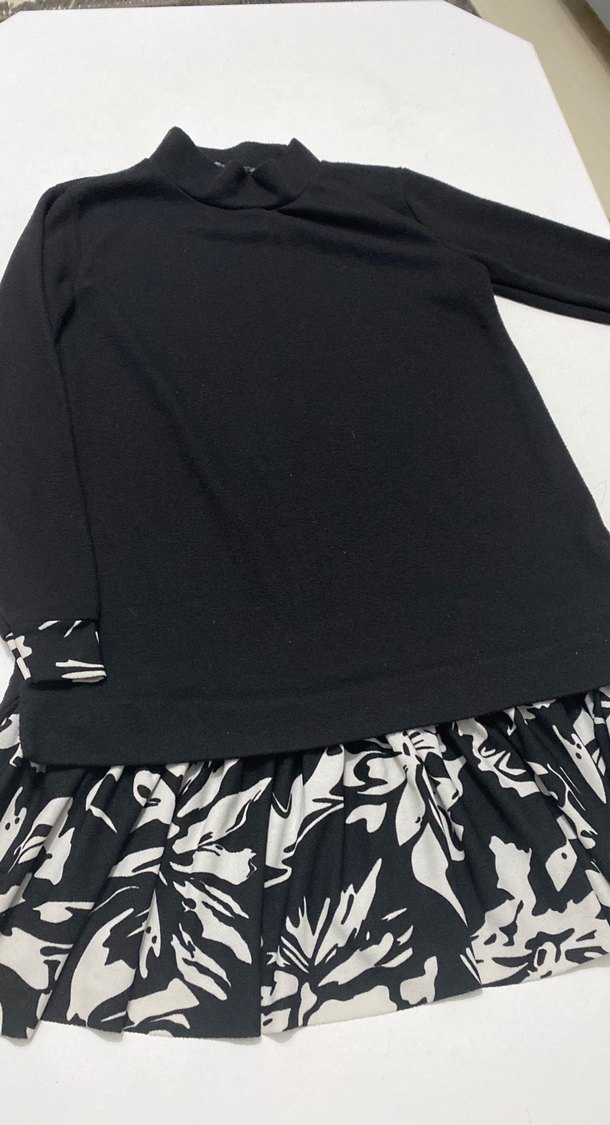 Siyah, uzun kollu ve yüksek yakalı tunik, yumuşak sentetik kumaştan. Piliseli, midi boy etek kısmı çiçek desenli, günlük kullanıma uygun.