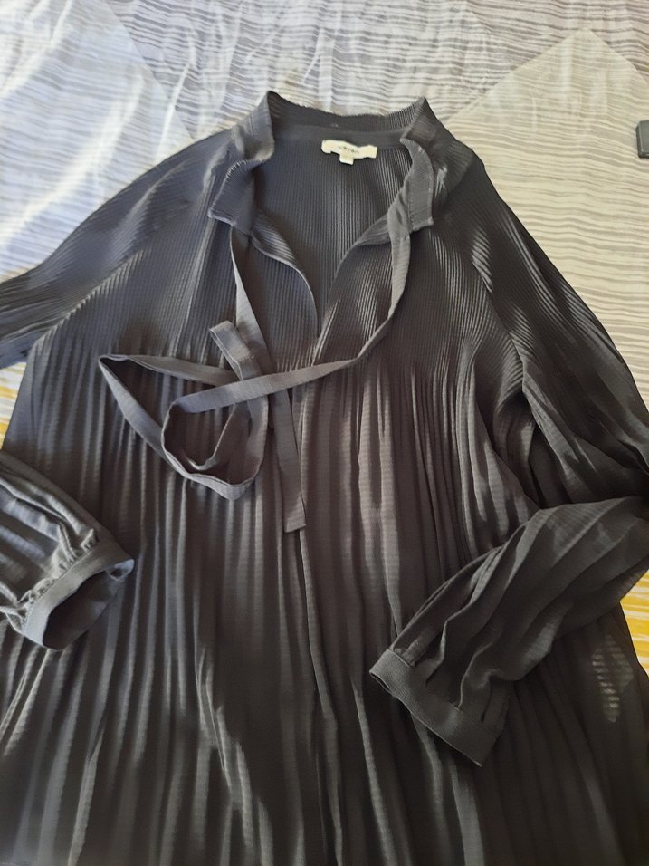 siyah bluz, piliseli ve ipekimsi kumaştan uzun ve bol kesimdir. Yaka detaylı, askılı kollu ve ofis için uygundur. Goth Paris tarzı yansıtır.