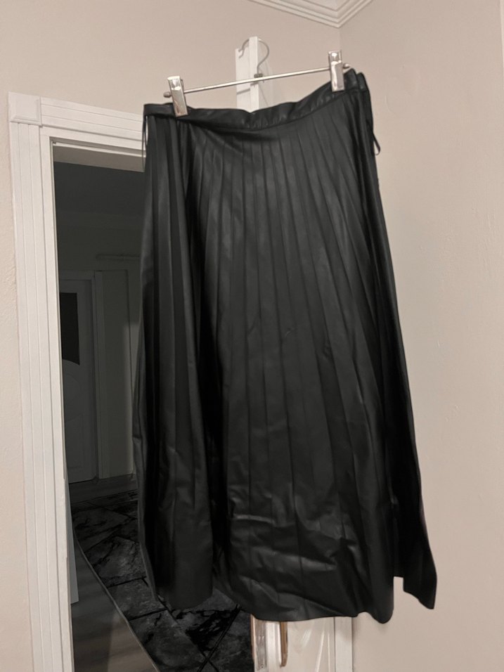 Siyah, piliseli ve bol kesim uzun etek. Düz sentetik kumaştan, gotik tarzda ve ofis için uygun.