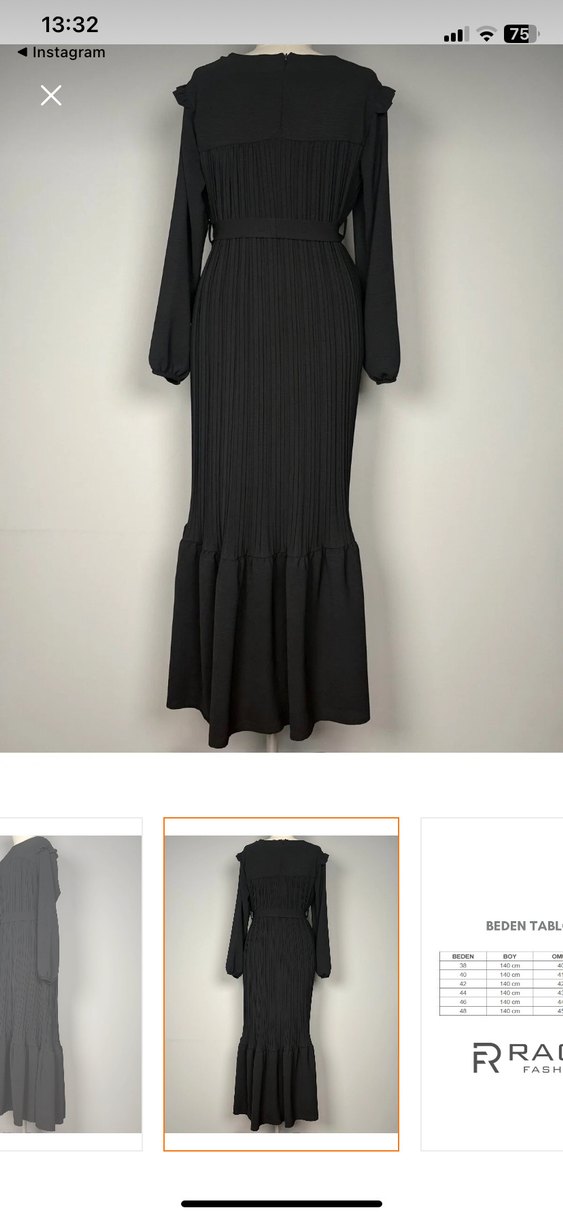 Hiç giyilmedi sıfır .Siyah piliseli uzun elbise, bol kesim, yüksek yakalı ve ince askılı kollara sahiptir. Düz, sentetik kumaştan yapılmıştır, minimalist ve gotik tarza uygundur.