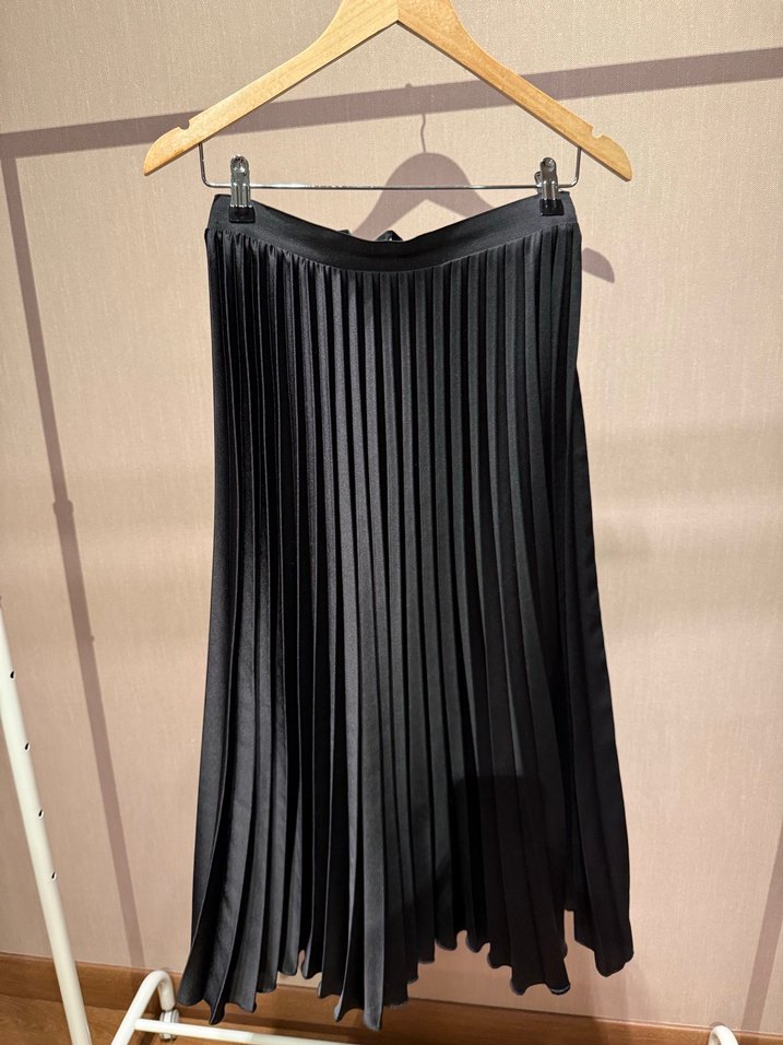 Siyah piliseli uzun etek, bol kesim ve ipeksi kumaştan üretilmiştir. Ofis için uygun, gotik ve Paris tarzını yansıtır.