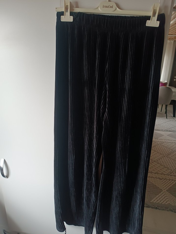 Siyah piliseli uzun pantolon, sentetik kumaştan ve dar kesim. Gotik tarzıyla ofis kullanımı için uygun.