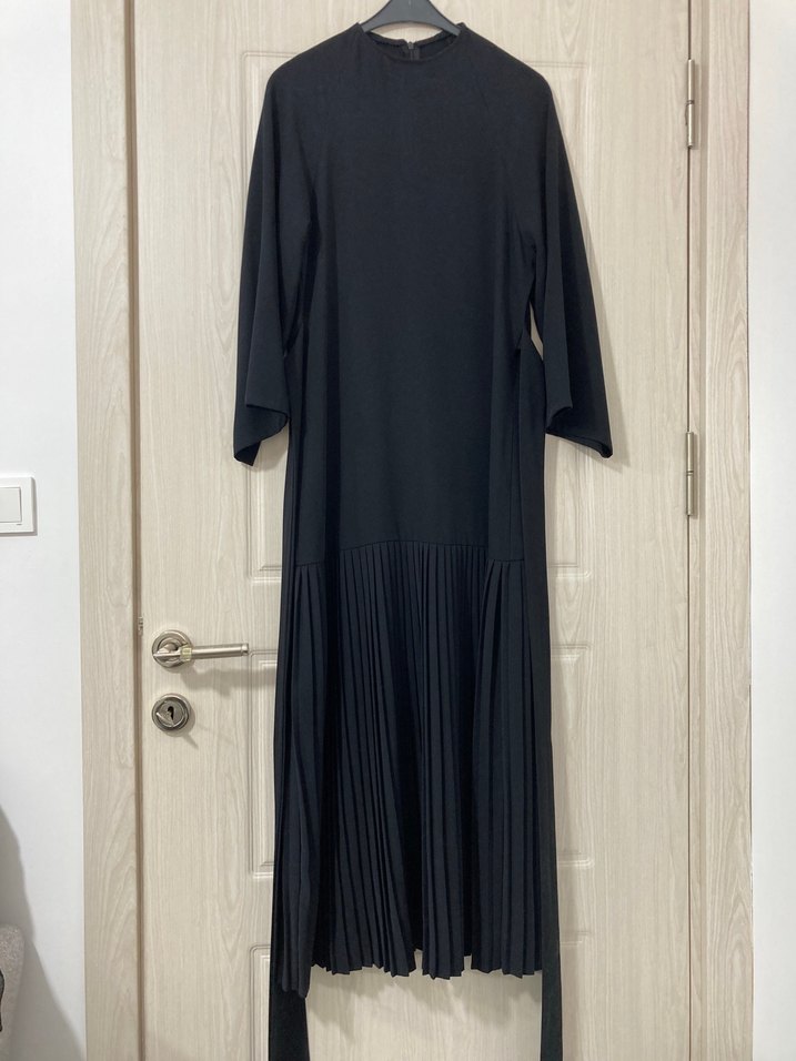 Siyah renkte, piliseli ve yüksek yakalı uzun kollu, rahat kesim elbise. Az kullanılmış defosu yoktur. Elbisenin omuzdan ölçüsü 133cm, kol ölçüsü 63cm’dir.