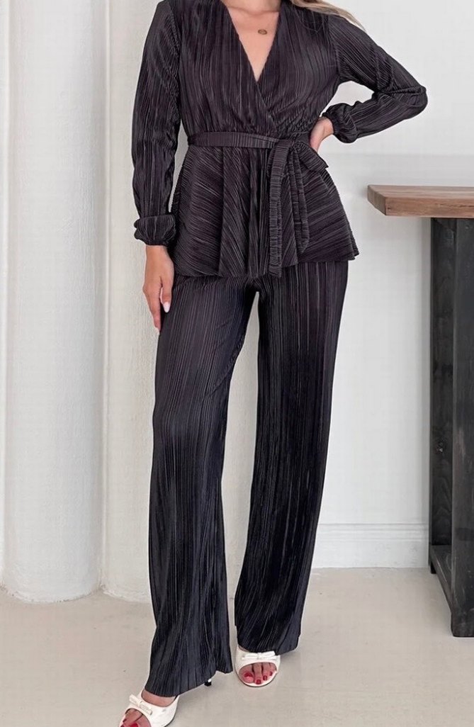 Siyah renkte, piliseli detaylı, V yaka ve uzun kollu kadın takımıdır. Regular kesim ve uzun boyludur, sentetik kumaştan üretilmiştir. Ofis kullanımı için uygundur ve kemerle tamamlanmıştır.