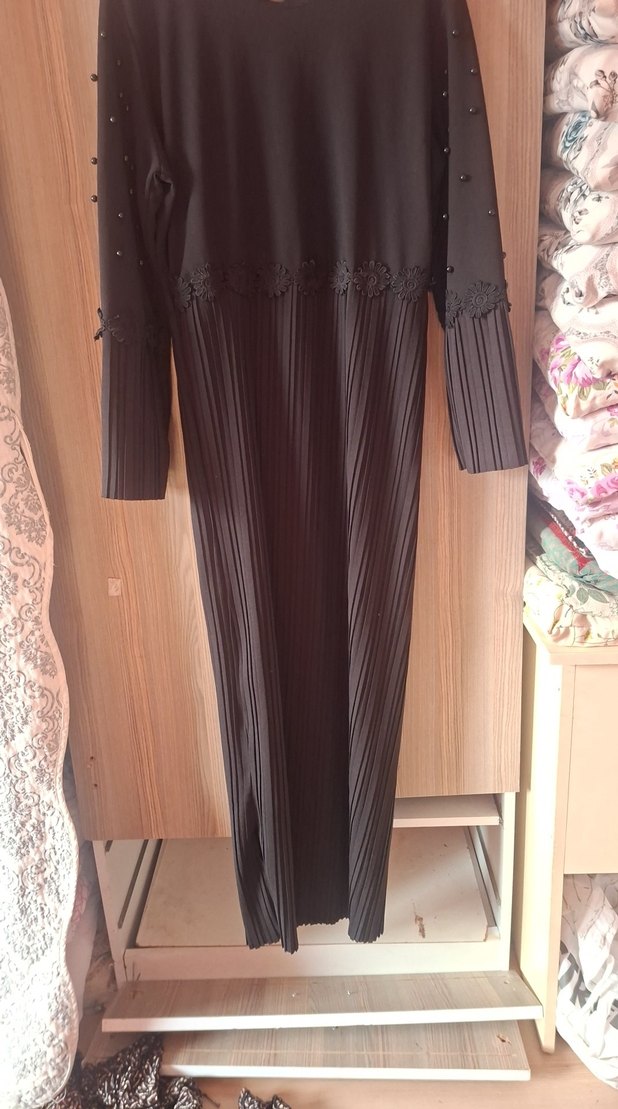 Siyah renkte, piliseli detaylı ve uzun kollu, yuvarlak yakalı uzun elbise. Sentetik kumaştan, düzenli kesim ve modest gotik tarzda, günlük kullanıma uygun.