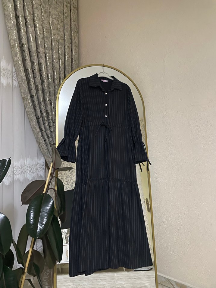 Siyah uzun kollu elbise, piliseli ve ince çizgili desenlidir. Regular fit, kemerli bel ve notched lapel yakaya sahiptir. Günlük kullanıma uygundur.