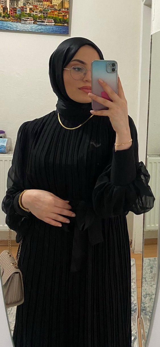 Siyah Piliseli Uzun Kollu Uzun Elbise