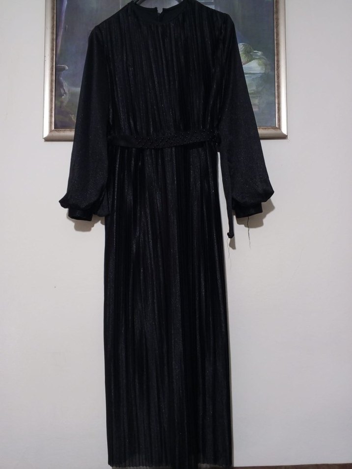 Siyah renkte, yüksek yakalı ve piliseli detaylı uzun elbise. Yumuşak sentetik kumaştan, uzun kollu ve bol kesimdir, çok az kullanıldı güzel görünüyor sadece kemer kısmında çok küçük bir yırtık vardır ama kemerle birlikte gözükmüyor.