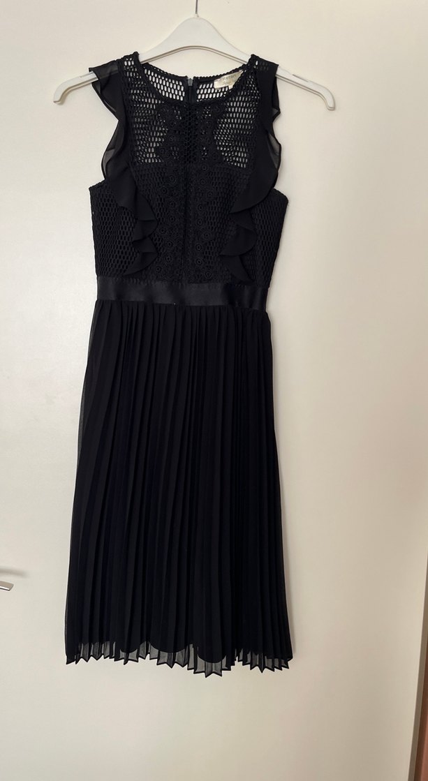 Siyah, kolsuz, yüksek yakalı ve piliseli detaylara sahip bu uzun elbise, gotik tarzıyla klasik zarafeti bir araya getirir. Ofis için uygun, dar kesim ve desensiz tasarım.