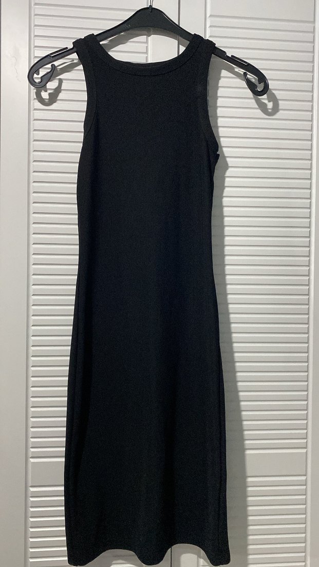 Siyah, kolsuz uzun elbise, yüksek yakalı ve piliseli detaylı, sentetik kumaştan, vücuda oturan kesime sahip. Günlük kullanıma uygun.