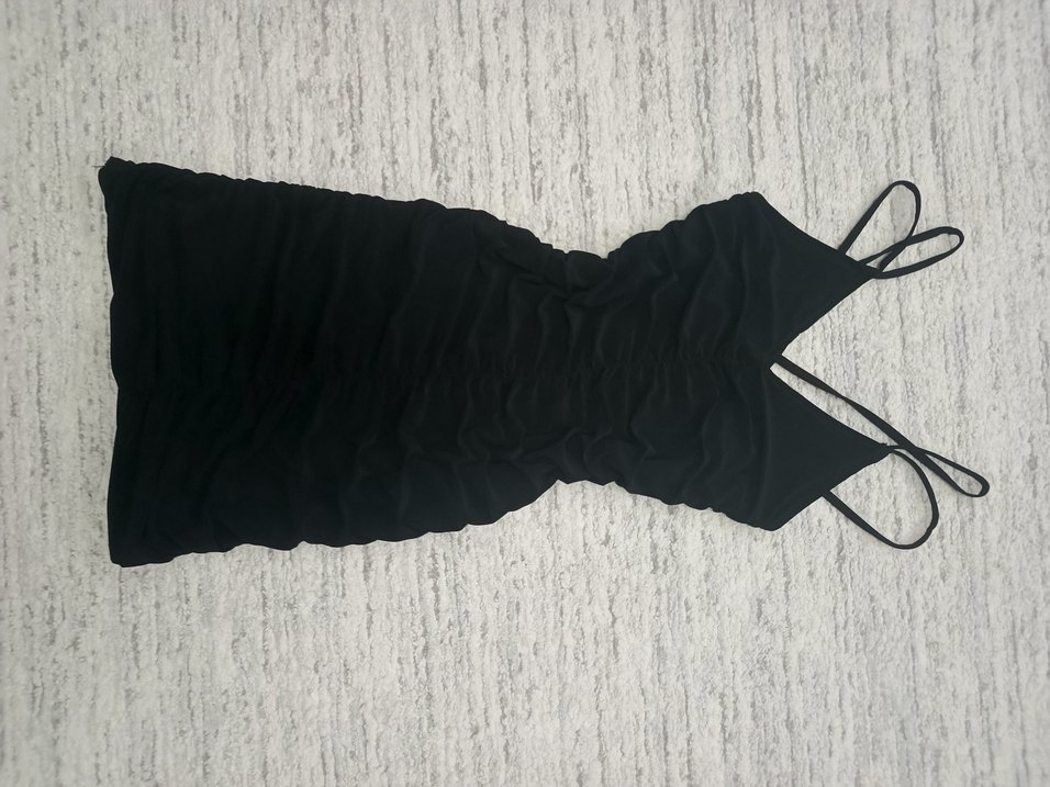 Bu siyah piliseli mini elbise, V yaka ve ip askılı olup, gotik ve şık bir görünüm sunar.