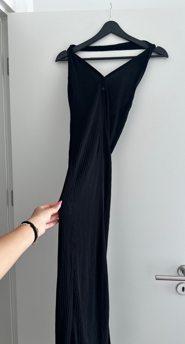 Siyah uzun elbise, piliseli detaylar ve V yaka ile fit kesime sahiptir. Askılı kollu, yumuşak sentetik kumaştan minimal goth tarzında.
