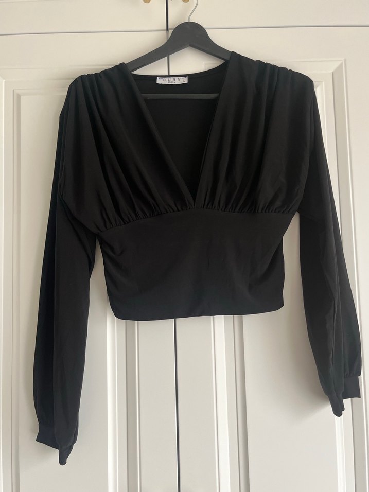 V yaka ve uzun kollu, piliseli detaylara sahip siyah, vücuda oturan kadın bluz. Pürüzsüz sentetik kumaştan, minimalist goth tarzı, günlük kullanıma uygun. Hiç kullanılmamıştır.