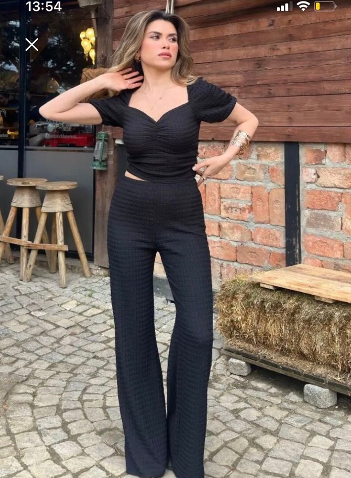 Siyah renkte, V yaka ve kısa kollu, piliseli detaylara sahip kadın takım. Rahat kesim ve uzun boydur, günlük sokak stili için uygundur.
