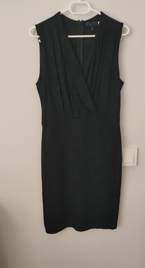 Siyah midi elbise, kolsuz ve V yaka tasarıma sahip, piliseli detaylarla şık ve dar kesim. Ofis için minimalist ve gotik tarzda uygun.