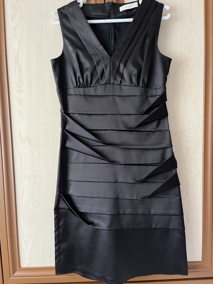 Kolsuz, v yaka ve piliseli detaylara sahip siyah midi elbise. Fitted kesim, ofis için avant-garde tarzda uygun.