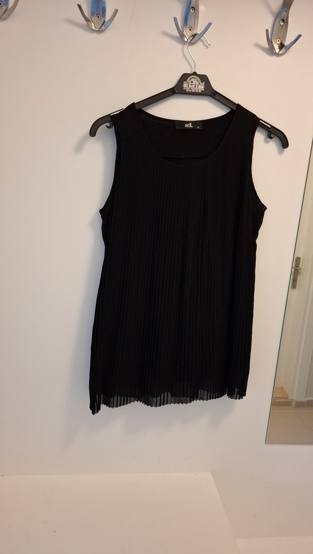 Siyah, kolsuz ve piliseli tasarıma sahip, yuvarlak yaka ve bol kesimli midi uzunlukta bluz. Düz sentetik kumaştan üretilmiş, günlük kullanıma uygun minimal ve gotik tarzda.
