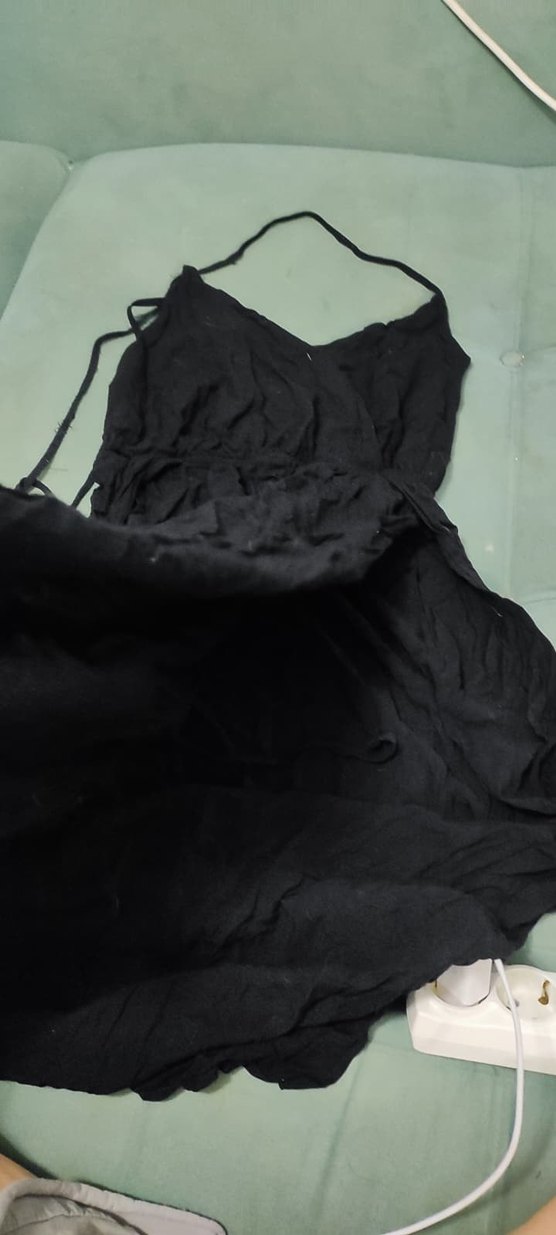 Siyah keten kumaştan, askılı kollu ve drapeli V yaka tasarıma sahip midi boy plaj elbisesi. Minimalist goth tarzını yansıtır, günlük kullanıma uygundur. belden açılır. tüylenmesi asla yok evim kedili