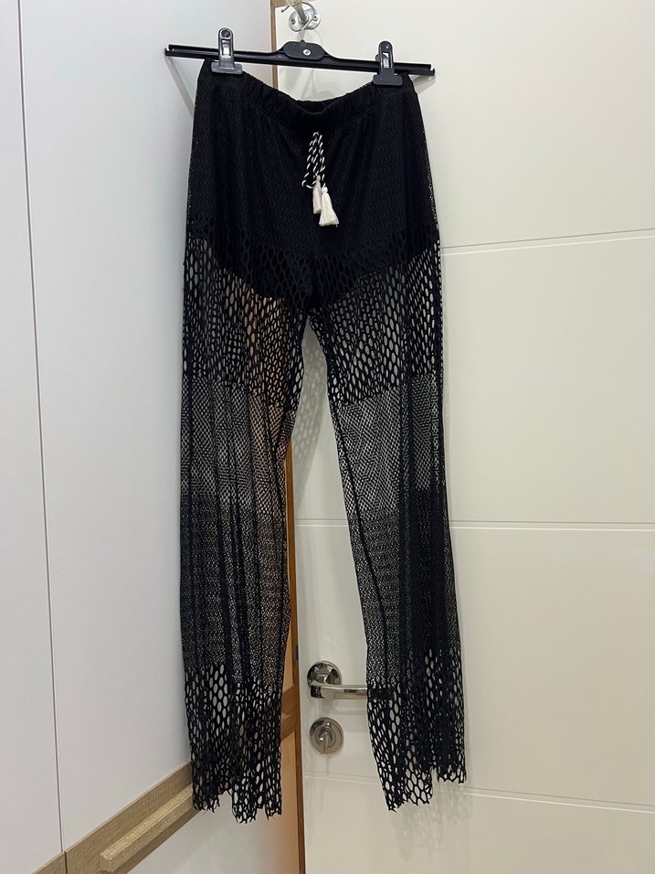 Siyah örgü kumaştan, içi astarlı ve belden bağlamalı plaj pantolonu. Yeni gibi. Herhangi bir kusuru yok. #plajgiyim #plajpantolonu #transparan #pantolon #penti