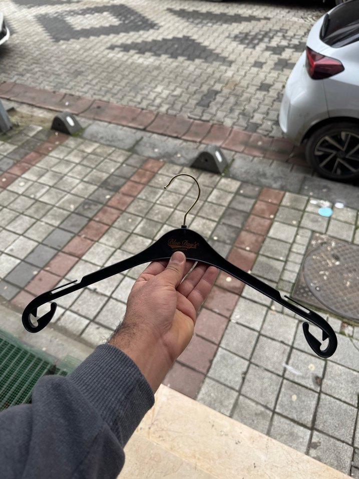 Adet fiyatı 3.5 TL 1000 adet mevcut Metal kancalı, kıyafet tutucu yivli siyah plastik askılar. Farklı giysiler için uygundur.
