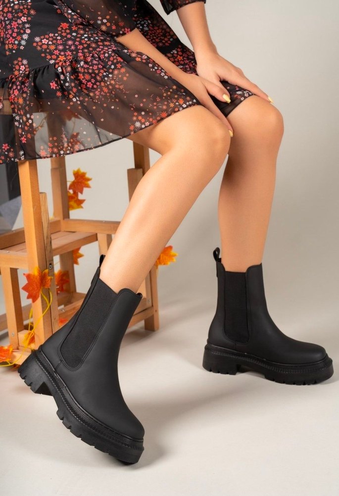 Siyah kauçuk kadın botlar, platform topuk ve kemer detayı ile sokak stili ve günlük kullanım için uygundur. Trendy ve sade tasarıma sahiptir.Sadede 1 defa giyildi tarzım olmadığı için satıyrm sıfırdır