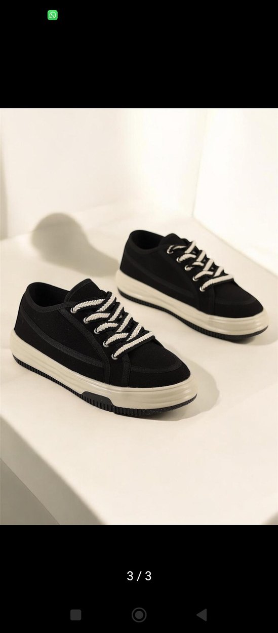 Siyah platform tabanlı kadın spor ayakkabısı, beyaz bağcık detaylı ve kauçuk tabanlıdır. Spor ve sokak stili için uygundur, zahmetsiz şıklık sunar.