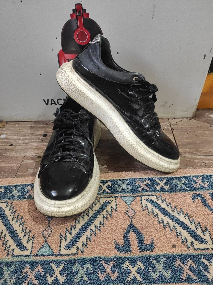 Siyah platform topuklu erkek spor ayakkabı, bağcıklı ve kauçuk tabanlıdır. Sokak stili ve rock punk havası taşır, günlük kullanıma uygundur.