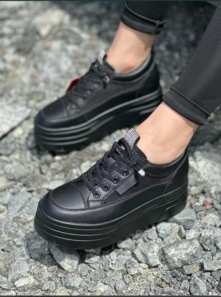 Siyah bağcıklı platform topuklu spor ayakkabılar, günlük sokak stili için uygundur. Koyu renkte ve desensizdir, rahat ve şık bir görünüme sahiptir.