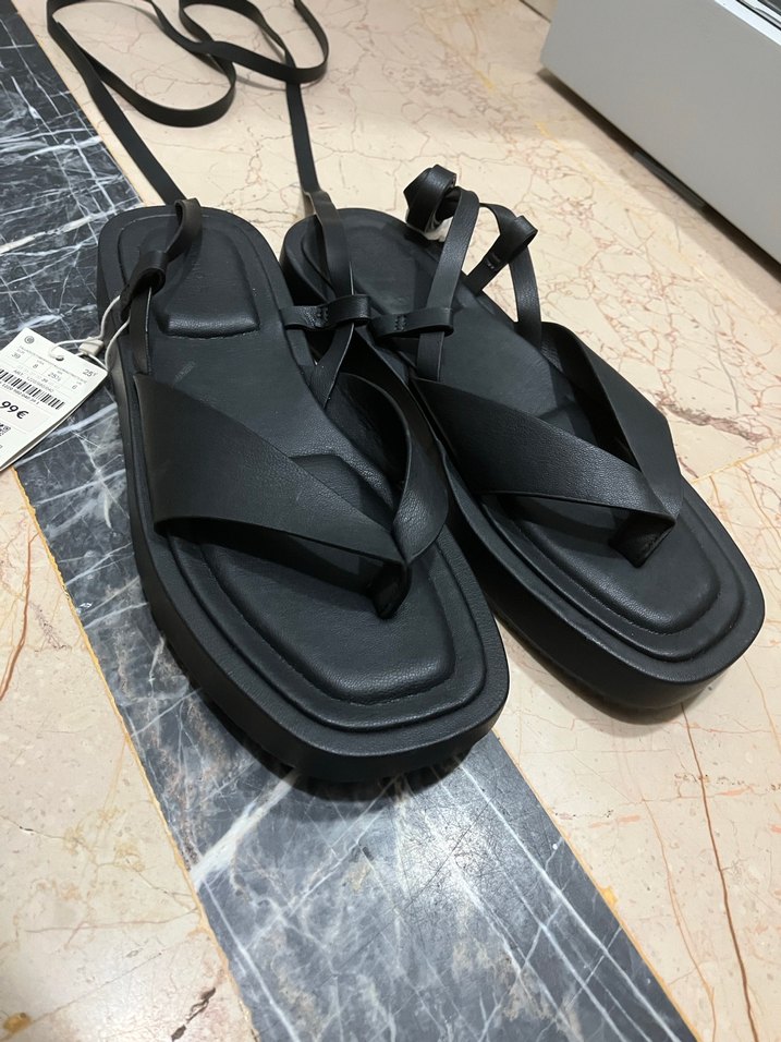 Siyah platform topuklu, bantlı ve minimalist gotik tarzda kauçuk kadın sandalet. Günlük kullanıma uygun. HİÇ GİYİLMEDİ ETİKETLİ