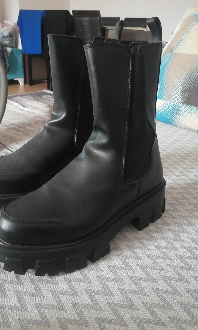 Siyah kauçuk goth tarzı kadın botları, platform topuklu ve tokalı, desen içermeyen şık tasarım, sokak tarzı için uygun.